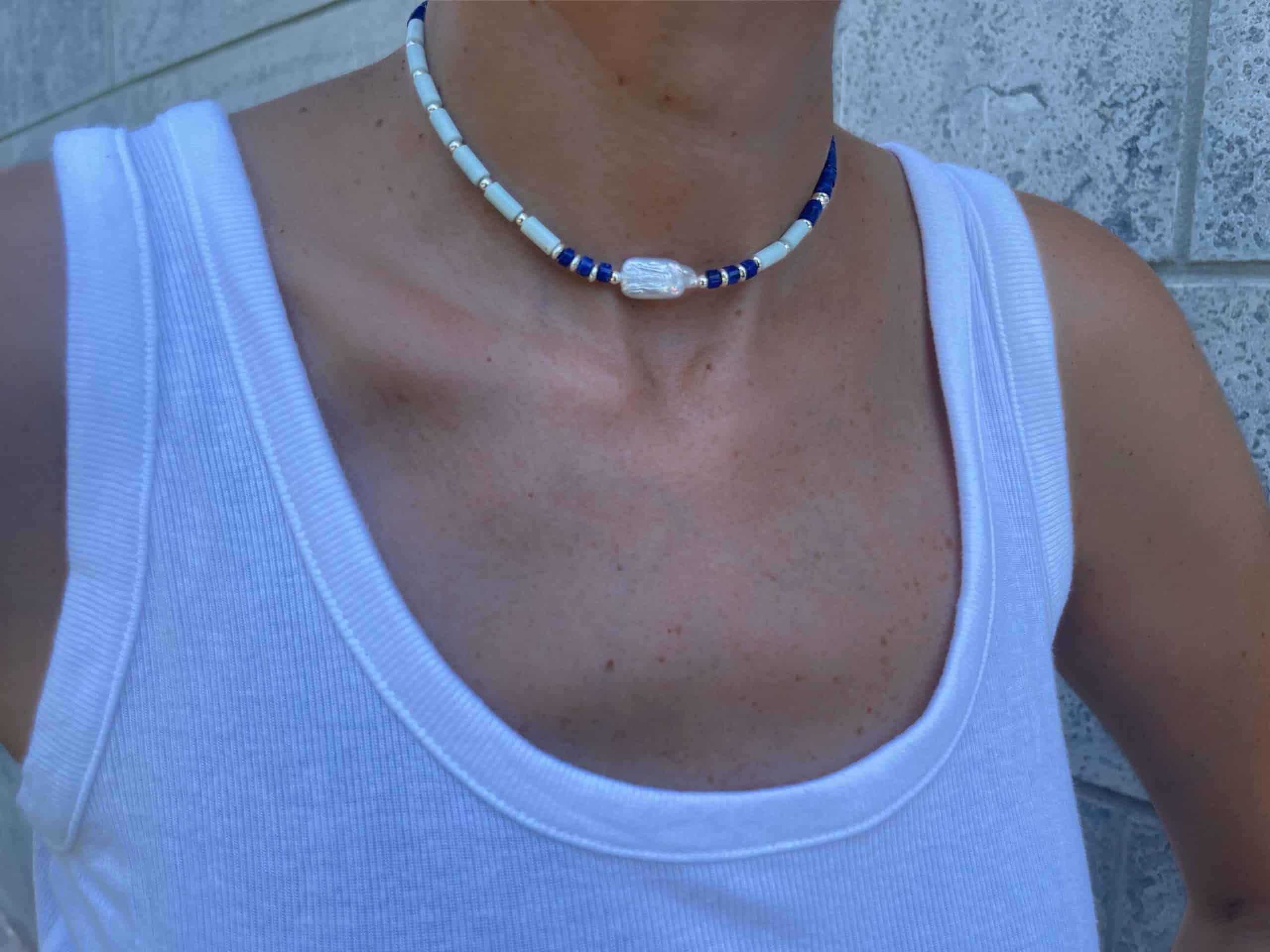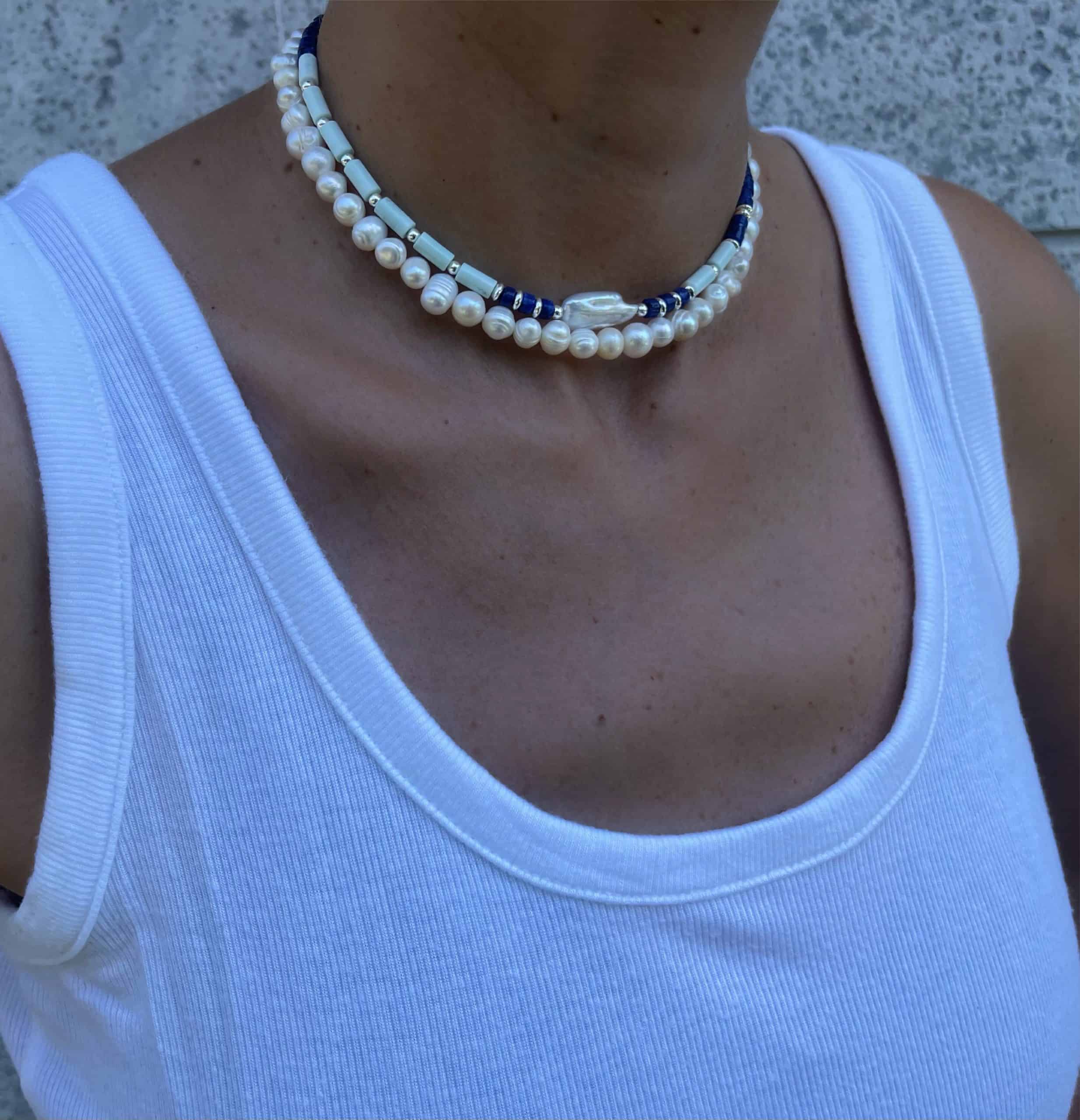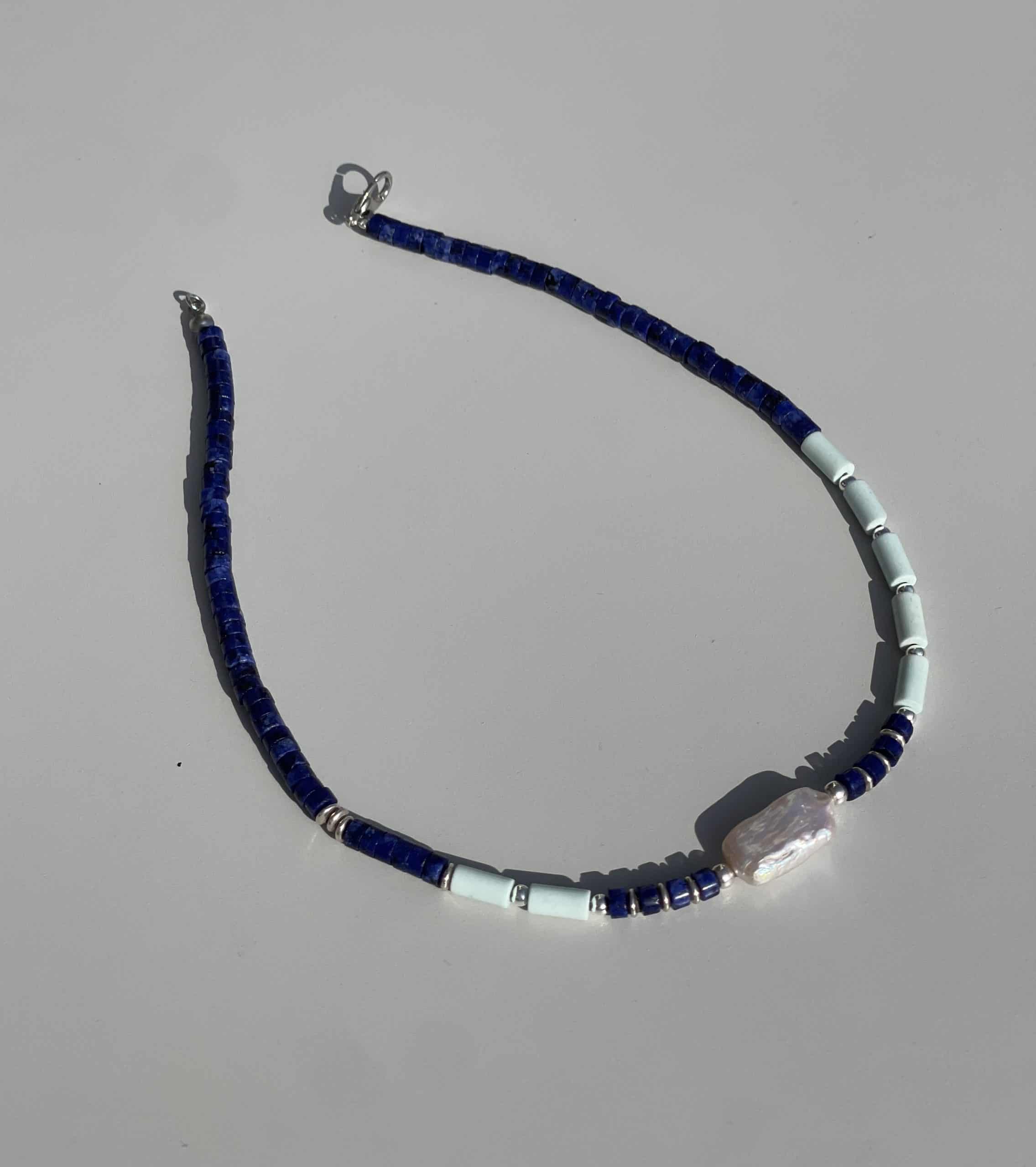 שרשרת אבנים בגווני כחול בשילוב פנינה וכדורי כסף 925.