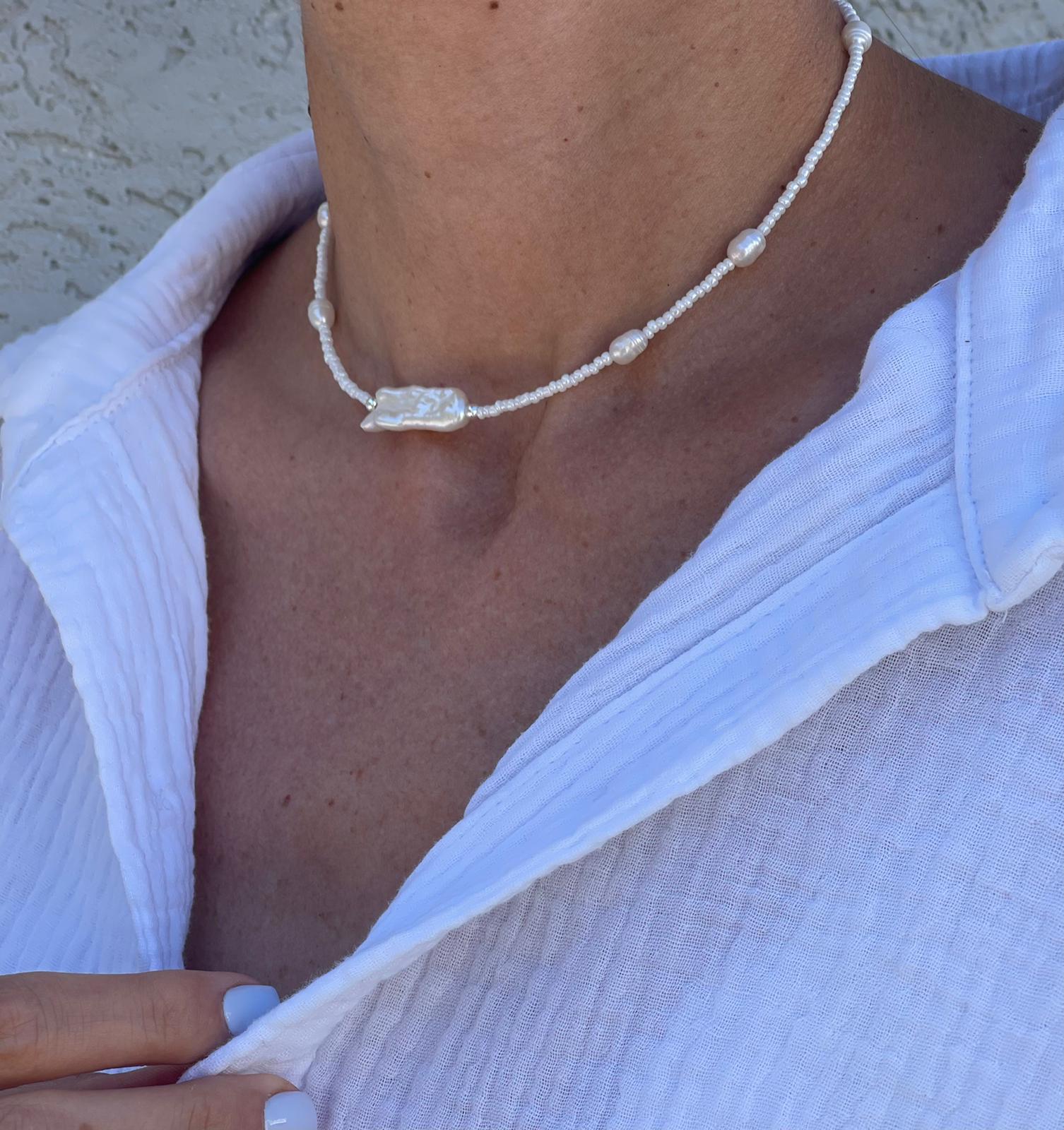 שרשרת חרוזים לבנים בשילוב פנינים בגדלים שונים.