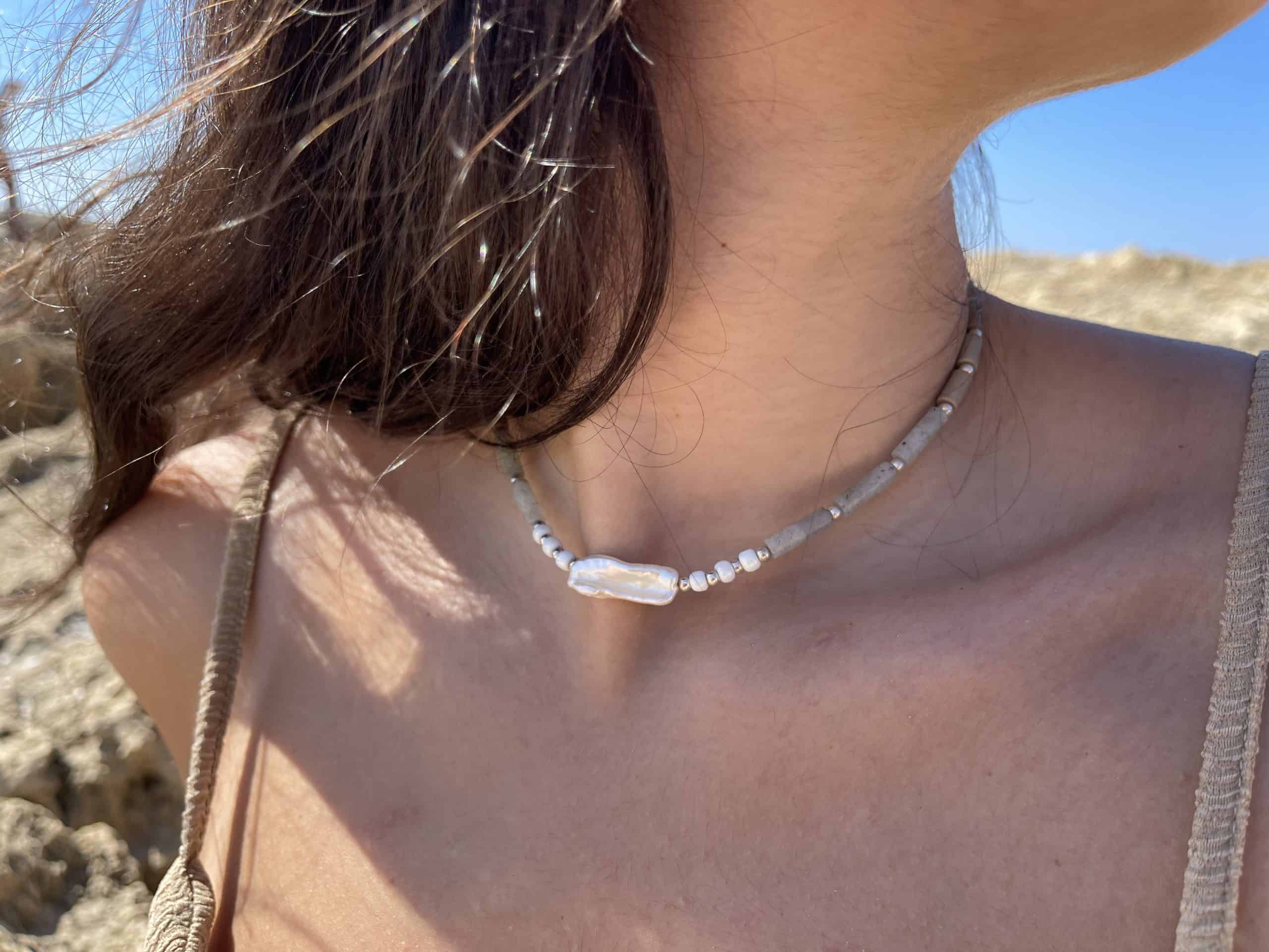 שרשרת אבני שיש בגווני אבן בשילוב פנינה וכדורי כסף 925.